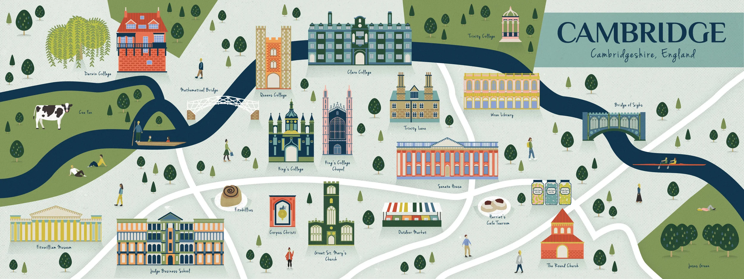 I've long been a fan of They Draw and Travel, so when I saw a call for submissions for their next book, They Draw and Travel: 96 Illustrated Maps of the UK and Iceland, I knew I wanted to be in it! Unfortunately for me, I've never been to the UK or Iceland and illustrating a map of a place you've never been can be tricky. I needed a brain to pick! Luckily, my friend Autumn lived in Cambridge for a year and she loves a good illustrated map. She's also the kind of person that you want to be your travel guide because she always knows all the best things to do and eat. She was totally game to be my client and provided me with all the information I needed.
