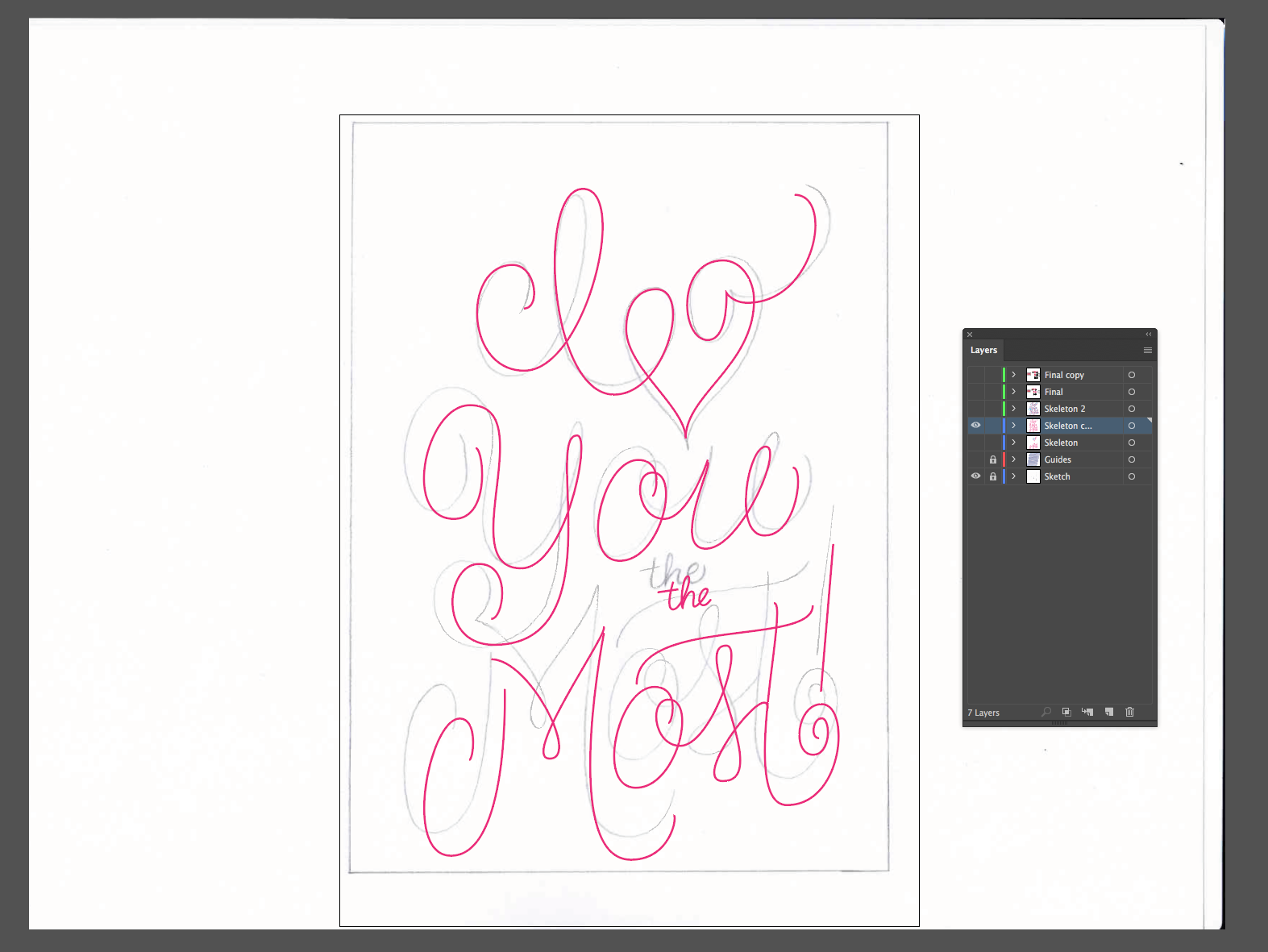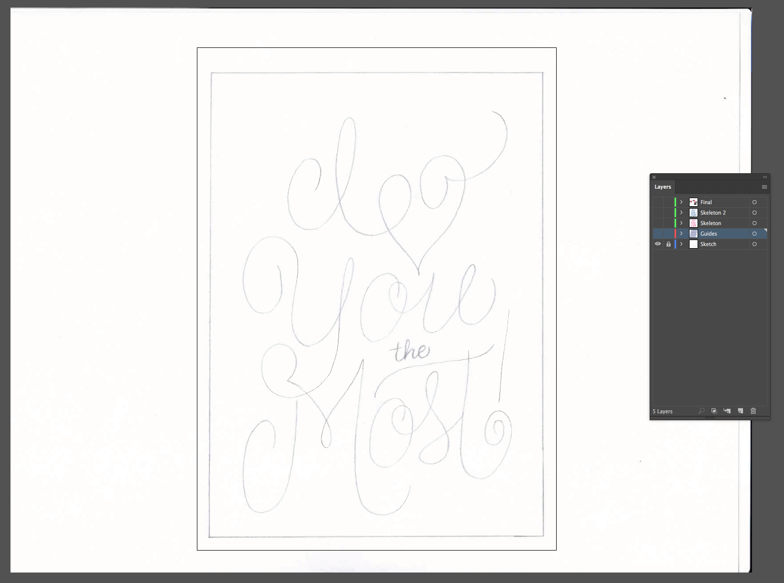 Last week I walked through the sketching process for this piece I did for Valentine's Day. Today I'm going to finish it up and show you the digital process. After scanning the final sketch, I bring it into Illustrator. I create a 5"x7" artboard and put the sketch on it's own layer, labeled "Sketch".