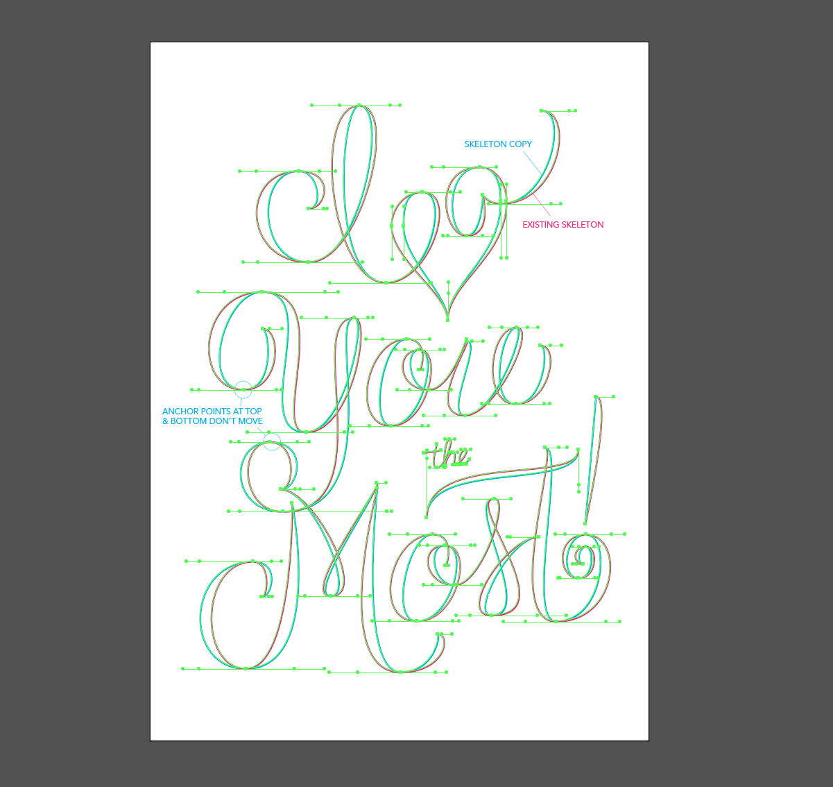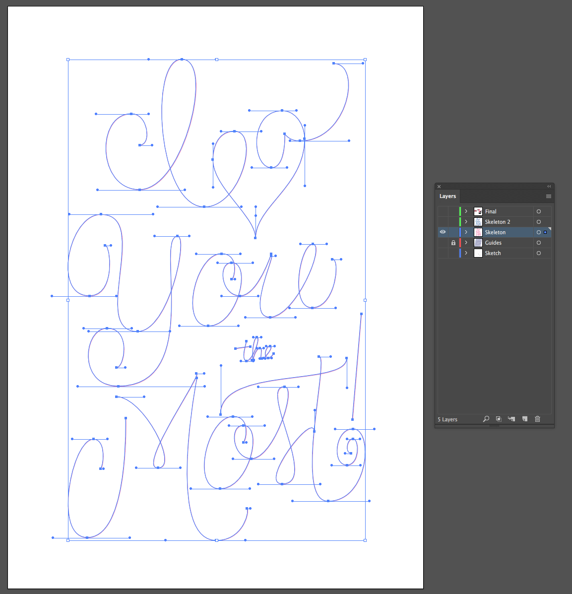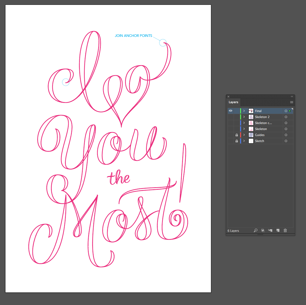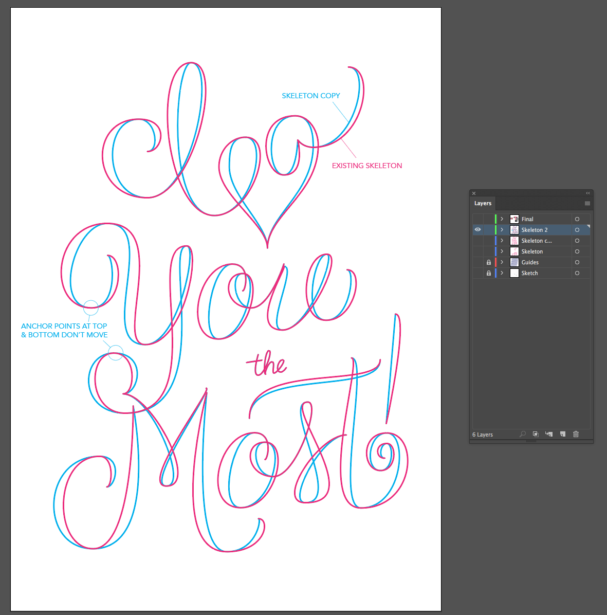 There are a few ways to add bulk to your letters and this is one that I really like for this calligraphic style. After my skeleton is in a really good place, I copy that layer (I love layers!). I then select the skeleton, copy it, lock it (cmd+2) and paste in place (cmd+shift+v). I make sure to change this copy to a different color so I can see what I'm doing. All anchor points at the end of flourishes, as well as those at the top and bottom of curves should stay where they are. I only want to add width to the letters.