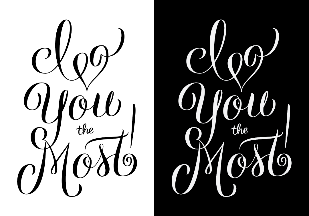 I fill in my lettering with black and also create an inverted version so I can get a better feel for the negative space. At this point I often print it out so I can look at it off screen, post it on Dribbble for feedback and in this case, I also posted it on Instagram for feedback. As much as I loved the "I" and the heart connecting, I was worried that it was making it unreadable, and based off of the comments I received, I was right!