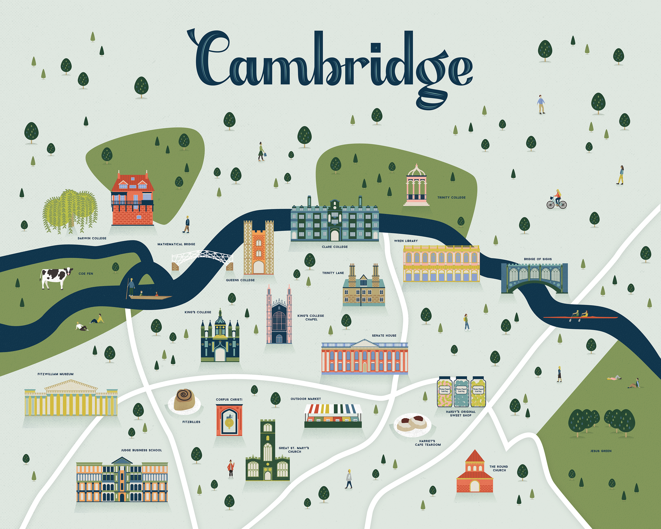 Map created for my friends, to help them remember their amazing year living in Cambridge, England. This map is also featured in the book"They Draw and Travel: 96 Illustrated Maps of the UK and Iceland"!